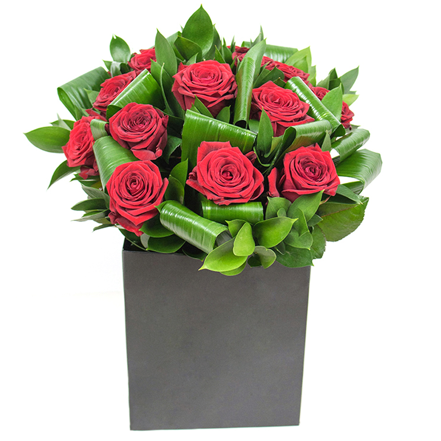 Illuminate your home with our radiant bouquet, showcasing vibrant red roses paired with lush aspidistra leaves and delicate ruscus. This unique design exudes elegance and style.