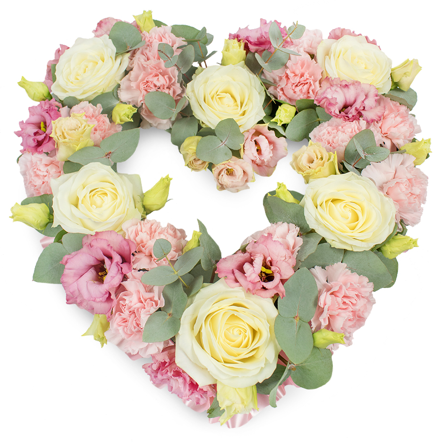Introducing our stunning tribute bouquet, an artful expression of remembrance. This arrangement features luminous white roses, gentle pink carnations, charming pink lisianthus, and vibrant eucalyptus leaves. Each flower is carefully selected for its freshness and visual appeal, offering a transcendent blend of warmth and sophistication.